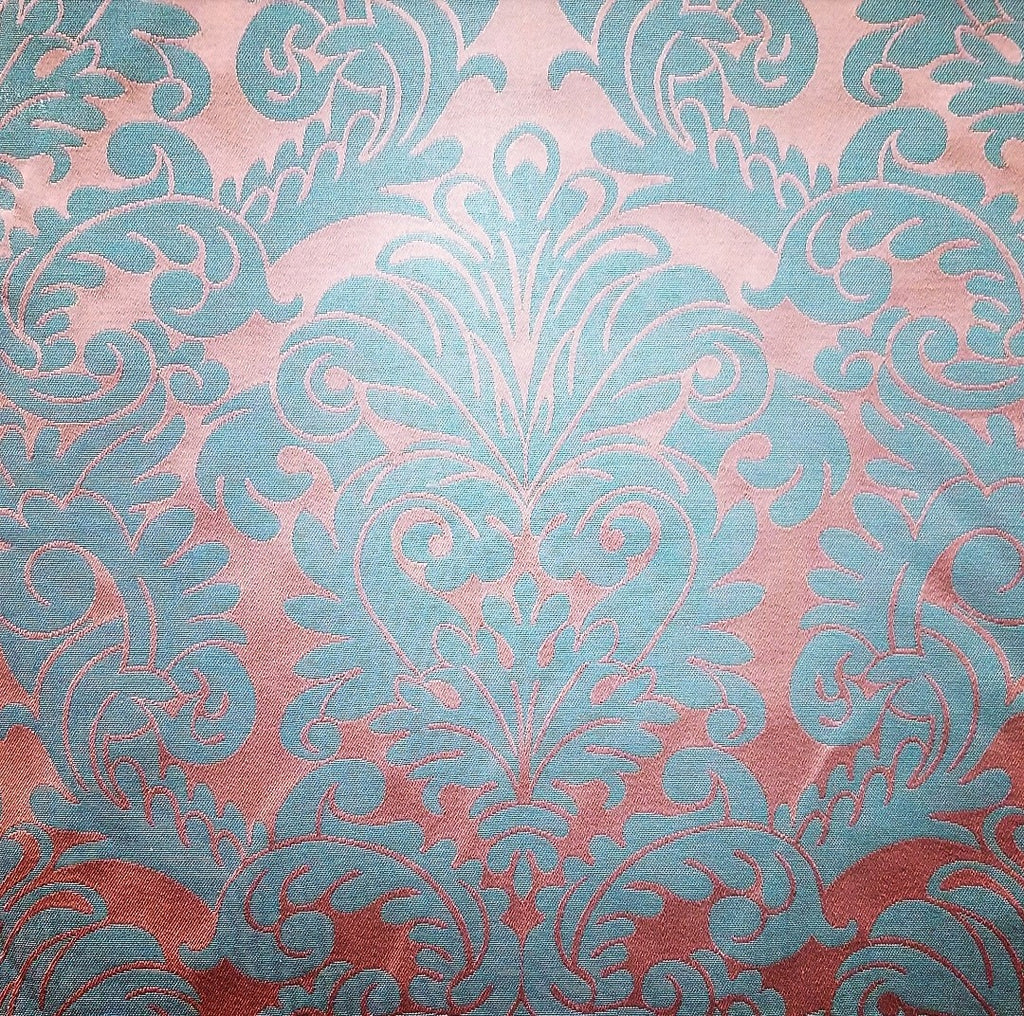 Karsten Damask features a sophisticated coral background elegantly paired with a greyish minty floral leafy pattern. This refined design brings a subtle yet distinctive charm, ideal for adding a touch of expert craftsmanship to your interiors or fashion projects. The harmonious color combination enhances versatility while maintaining a polished, timeless appeal.