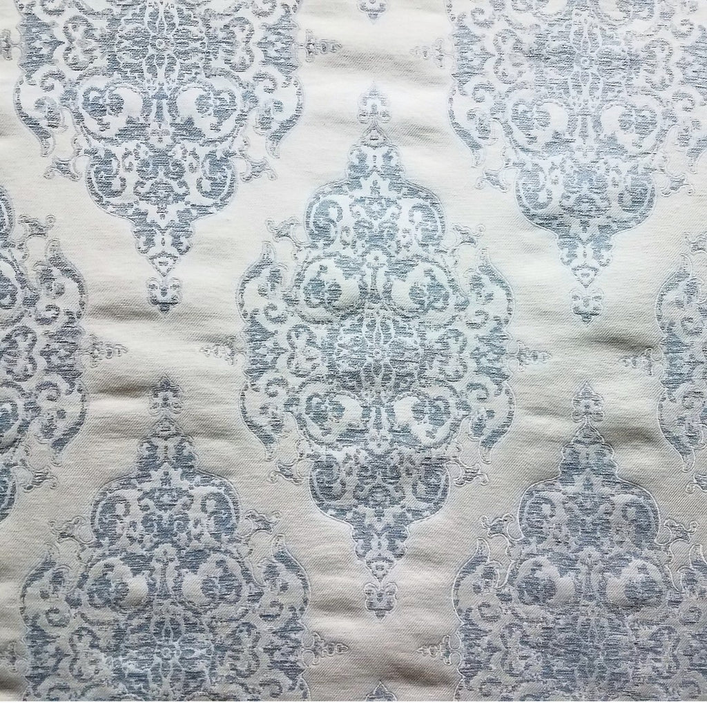 Livia fabric features an elegant floral damask pattern woven in sophisticated blue and silver tones. This textile combines classic design with a refined color palette, making it ideal for upscale upholstery, drapery, or decorative accents. Its intricate pattern and subtle sheen enhance any interior with timeless style and depth.