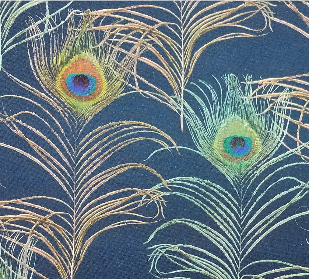 Émilienne fabric showcases a unique peacock feather-inspired design, capturing the essence of this majestic bird. Its rich ancient blue tones blend seamlessly with vibrant golden orange highlights, creating a striking visual depth. Perfect for sophisticated projects, this fabric offers both elegance and a distinctive character that stands out in any setting.