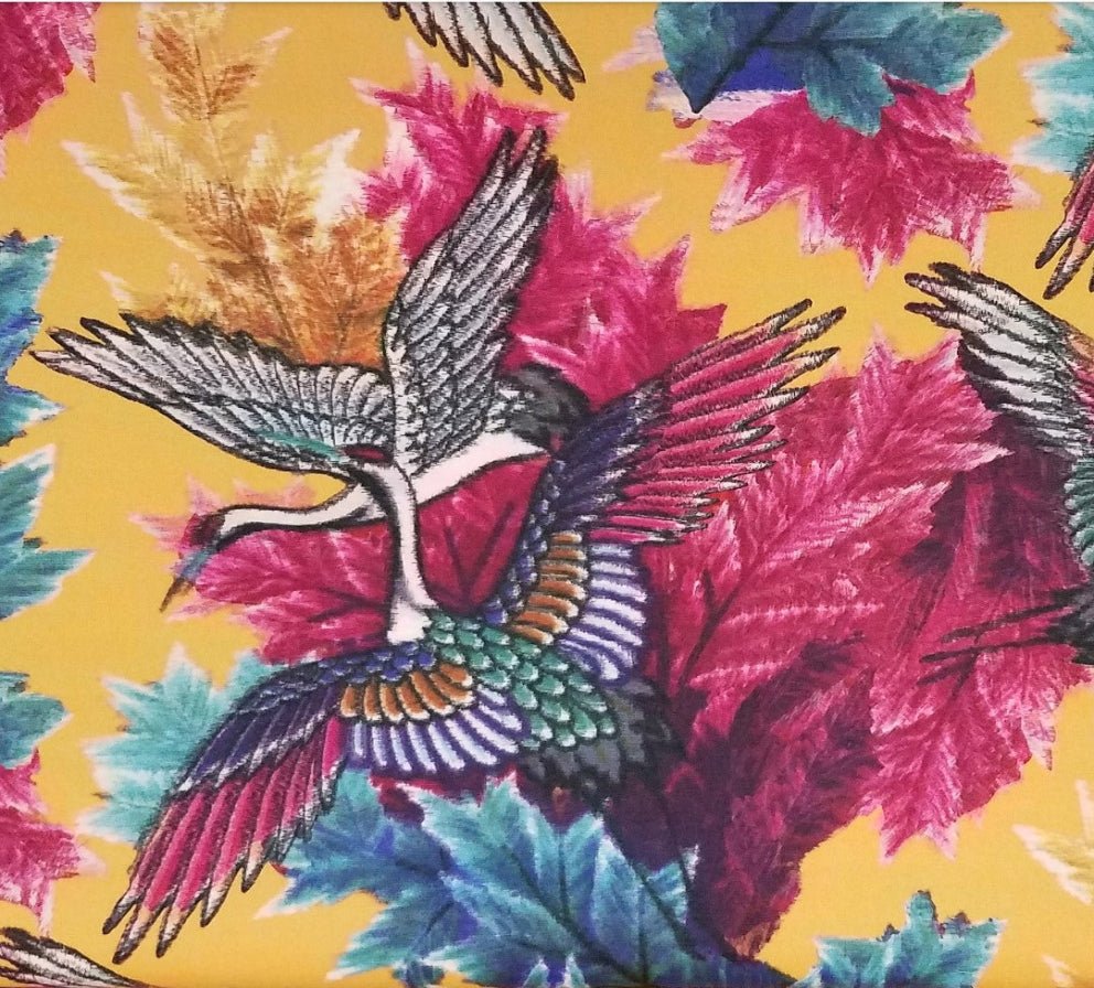 Elevate your projects with Léonie, a vibrant fabric showcasing graceful birds and lush leaves against a sunny yellow backdrop. This lively design brings warmth and nature-inspired charm to any creation, perfect for adding a cheerful touch to your home décor or fashion pieces. Embrace the beauty of the outdoors with Léonie’s captivating pattern and bright color palette.