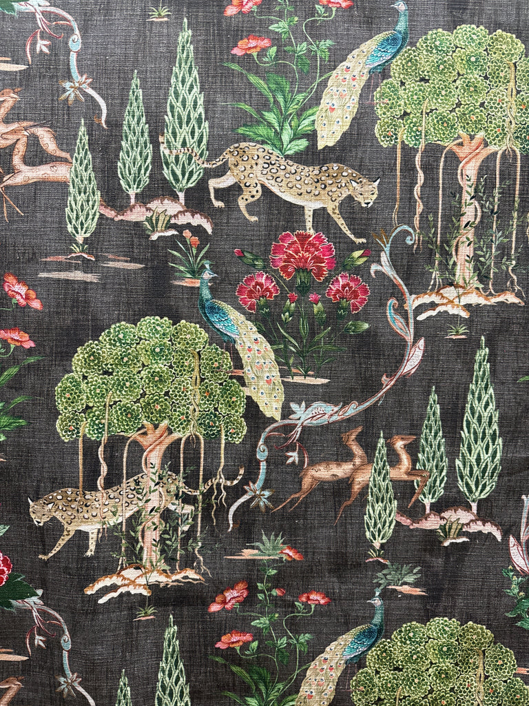 Carville fabric showcases an enchanting mix of floral and animal patterns set against a deep, dark background. This distinctive design brings vibrant life and sophistication to any project, making it ideal for fashion or interior accents that demand attention. Choose Carville to add a bold, natural elegance that transforms ordinary fabric into a statement piece.