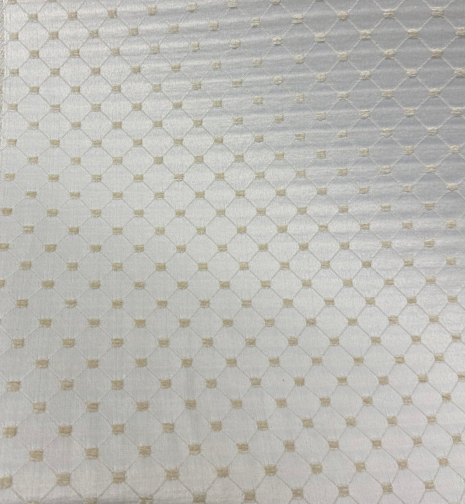 This exquisite fabric, named Secret, showcases a refined diamond pattern delicately outlined with charming polka dots. Set against a soft iridescent background, the design shimmers subtly, creating a captivating interplay of light and texture. The gentle glow enhances the intricate detailing, making it an elegant choice for sophisticated garments or decor that require a touch of understated glamour and visual intrigue.